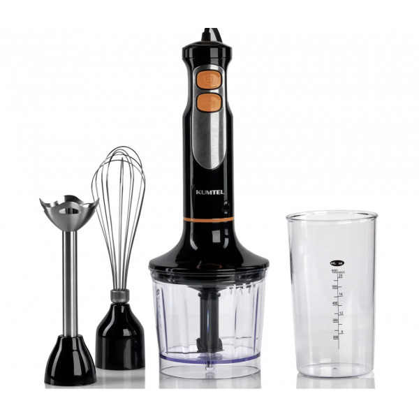 KUMTEL HHB-01 Black має знімну металеву ніжку блендера та лезо з нержавіючої сталі для довговічності. У комплект входить чашка-мішалка об’ємом 600 мл, а також насадки: вінчик та подрібнювач. Управління однією кнопкою на корпусі забезпечує простоту експлуатації.