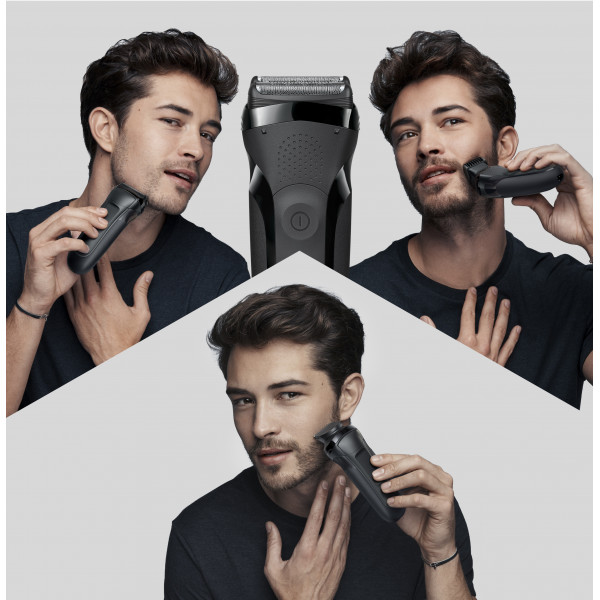 Електробритва Braun Series 3 300 оснащена потрійною бритвеною системою (дві сітки SensoFoil і проміжний тример).