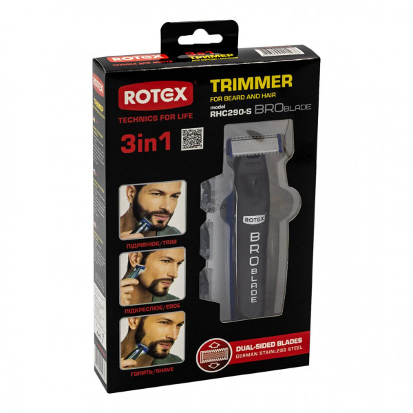 Rotex RHC290-S BroBlade- продукт довгих розробок і тестів молодий, але добре зарекомендувала себе фірми, все розробку якої спрямовані на задоволення потреб клієнтів. Надійний акумулятор дозволяє насолоджуватися безперервною роботою протягом 45 хвилин, за цей час можна привести в гідний вигляд бороду будь-якої складності. Час зарядки до максимуму- 8 годин, при необхідності можна працювати безпосередньо від мережі і зовсім не контролювати ступінь зарядженості акумулятора приладу. Метод зарядки- провід USB, в разі його втрати завжди можна скористатися, іншим, що заощадить гроші на покупку нового зарядного пристрою. Нержавіюча сталь- найсучасніший і довговічний матеріал, який і використовується при виробництві насадок для тріммера Rotex RHC290-S BroBlade. Він не деформується і не втрачає своїх якостей з часом. Для гігієнічного догляду за тримерами передбачена щіточка для очищення і можливість промивати насадки під проточною водою будь-якої температури.
