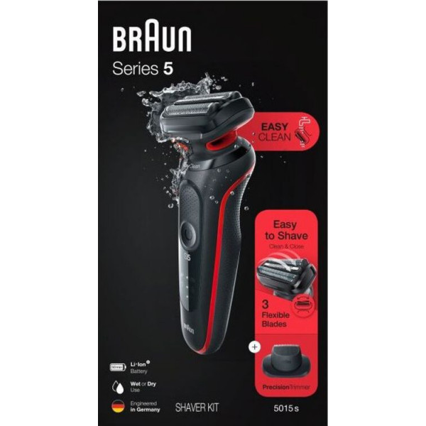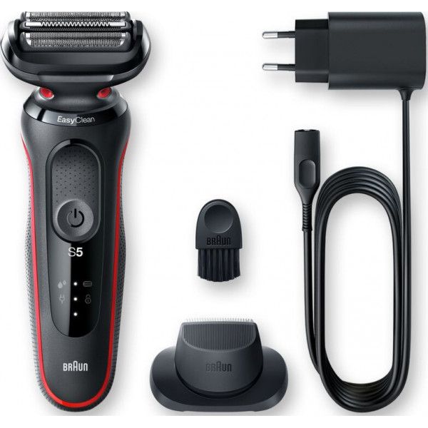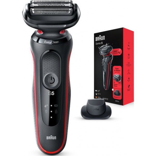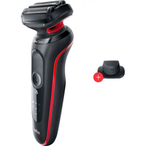 Braun Series 5 51-R1200s BLACK/RED - гладке гоління стало простіше: 3 гнучкі леза цієї електробритви плавно повторюють контури вашого обличчя, а система EasyClean дозволяє швидко і легко чистити, не знімаючи бритвенну головку. Ефективний навіть при жорсткій щетині: технологія AutoSense аналізує щетину та регулює потужність залежно від її густоти, захоплюючи та підрівнюючи більше волосся при кожному голінні. У комплект входить насадка для точного підрівнювання вусів та бакенбардів.