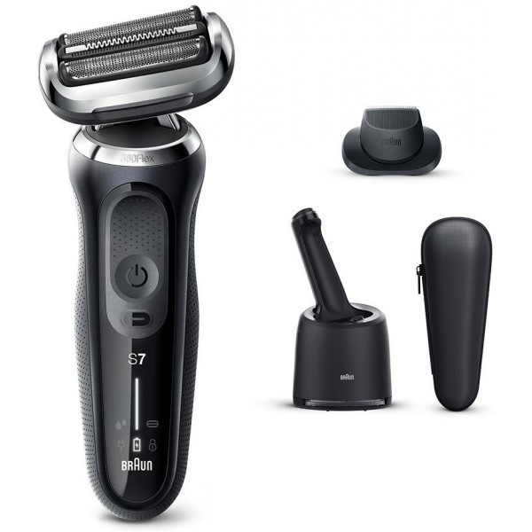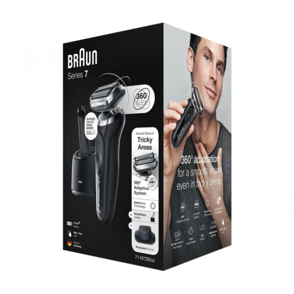 BRAUN 71-N7200cc Series 7 — потужна електробритва із системою гоління 360° для максимально гладкого результату навіть у важкодоступних місцях. Плавна рухома голівка ідеально повторює контури обличчя для досягнення ідеальних результатів. Чудовим доповненням є тример для підстригання вусів та бакенбардів, насадка входить у комплект.