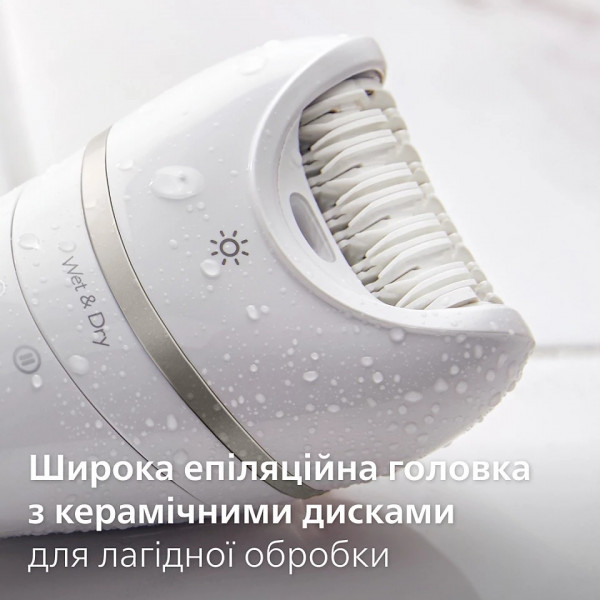 Для чутливих ділянок тіла, таких як зона бікіні чи пахви, передбачена бритвена головка з тримером-гребінцем, яка робить гоління м’якшим і комфортнішим. Основна епіляційна система включає 32 керамічні гіпоалергенні диски, що легко ковзають по шкірі, зменшуючи тертя. 91% жінок відзначили, що їхня шкіра почувається значно краще під час використання цього епілятора.