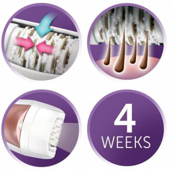 Епілятор створений для підтримки краси вашого тіла. Для ефективного видалення волосся розроблені 24 високоточних пінцета запатентованої форми, які розташовані під кутом і забезпечують захоплення найменших волосків. Технологія Air Pulse концентрує холодне повітря в зоні епіляції і шкіра максимально знеболюється в момент видалення волоска. Масажні кульки додатково знімають больовий ефект.