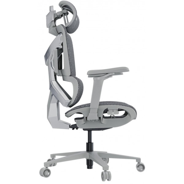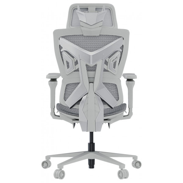 Крісло оснащене ультраповітропроникною сітчастою тканиною, сплетеною з фланеллю, яка пройшла тестування на зносостійкість (1000 циклів) і забезпечує відмінну вентиляцію, запобігаючи перегріванню. Динамічна поперекова підтримка С-подібної форми інтегрована в спинку та активно адаптується до рухів тіла, зменшуючи навантаження на поперек. Спинка регулюється в діапазоні 105°–126° за допомогою саморегулювального механізму нахилу, чутливого до ваги, з чотирма фіксаторами та ручкою для налаштування пружності. Завдяки ширшій зоні плечей, спинка підтримує тіло під час бічних рухів. 5D-підлокітники дозволяють налаштувати висоту, глибину, ширину та кут повороту, а 3D-підголівник регулюється за висотою й нахилом для оптимальної підтримки шиї.