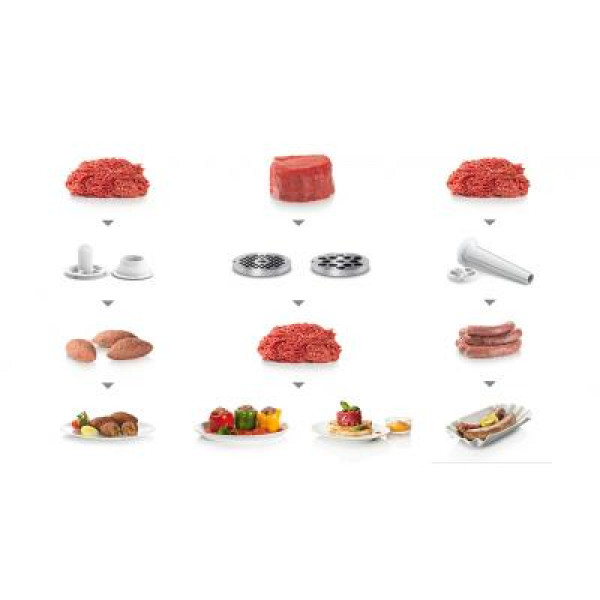 У комплект м'ясорубки BOSCH MFW 3520 G входить велика кількість змінних дисків і різних насадок. Це перетворює пристрій в універсальний комбайн, який стане незамінним помічником на вашій кухні. Диски для формування фаршу, насадки для ковбасок та кебаба дозволять вам приготувати безліч смачних страв. Всі насадки з легкістю встановлюються і знімаються. Для цього потрібно лише натиснути на кнопку і повернути насадку. Потрібно відзначити, що вони легко миються.