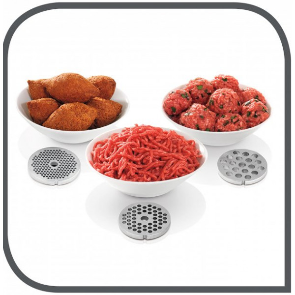 Три решітки з нержавіючої сталі(тонкого, середнього або грубого подрібнення) для трьох видів подрібнення залежно від вашої страви.Універсальність