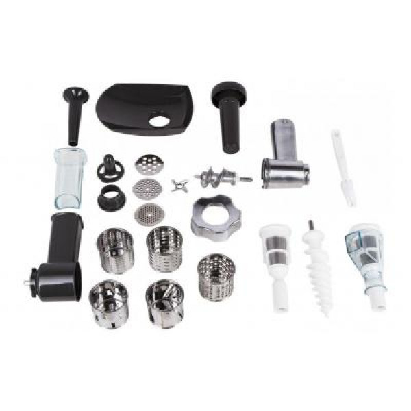 Потужна і універсальна м'ясорубка для приготування фрикадельок, ковбас і гарнірів завдяки своєму багаторазовому приладдю: подрібнювачі і нарізні барабани, насадки для формування кебів і ковбас.