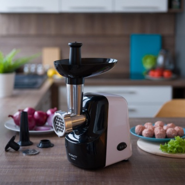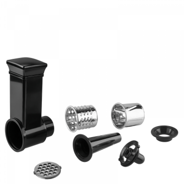 В комплекті 6 насадок: 2 перфоровані решітки з отворами 5 і 7 мм, насадки для кеббе та для приготування домашньої ковбаси, овочерізка з великої теркою і шинкування.