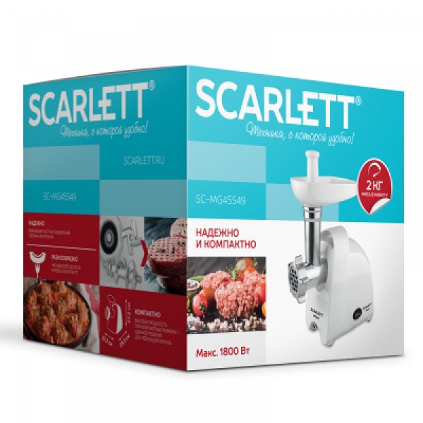 Нерідко відповідно до рецептури того чи іншого блюда потрібно подрібнити м'ясо, птицю або рибу. Для таких цілей створена м'ясорубка Scarlett SC-MG45S49. Цей пристрій з легкістю перетворить шматок м'яса в дрібний фарш, придатний для приготування котлет або фрикадельок. Продуктивність цієї м'ясорубки знаходиться на висоті: за одну хвилину своєї роботи вона з легкістю перемеле 1.5 кг м'яса. При цьому максимальна потужність її електроспоживання не перевищить 1800 Вт.