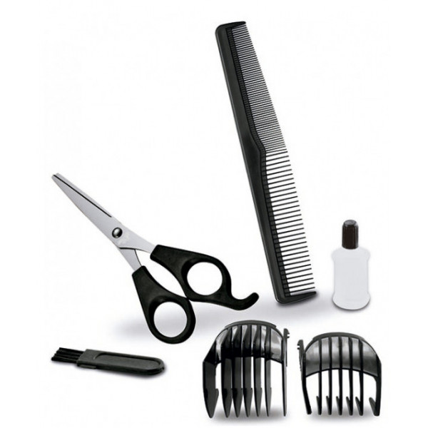 Аксесуари: щіточка для чистки, масло для змащення, гребінець, ножиці, насадка для короткого волосся, насадка для довгого волосся, стенд для зарядки