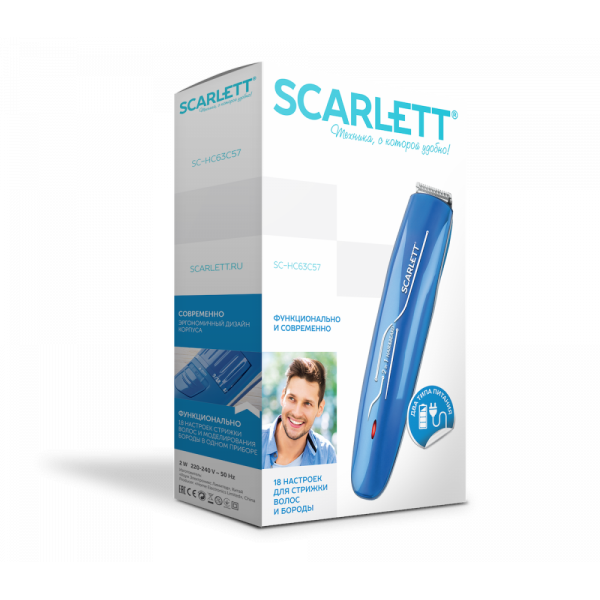 Бренд - Scarlett; Кількість насадок в комплекті - 2; Максимальна довжина стрижки - 18 мм; Покриття лез - нержавіюча сталь; Мінімальна довжина стрижки - 1 мм; Джерело живлення - мережа + акумулятор;