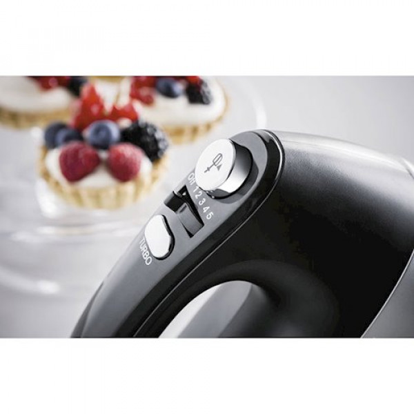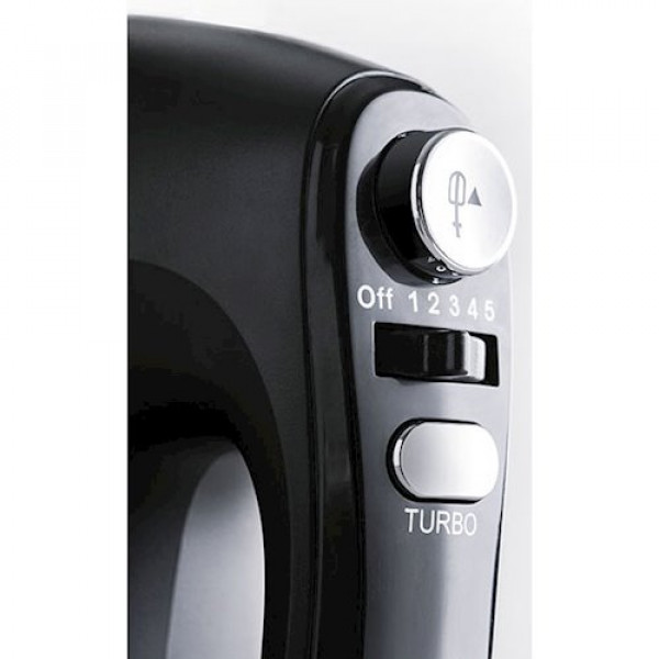 Міксер простий у використанні, відрізняється надійністю, якістю виготовлення і стильним дизайном. Прилад має потужність 300 Вт, працює в п'яти швидкісних режимах, а так само в прискореному турборежимі. П'ять рівнів режиму роботи дозволять вибрати оптимальну швидкість в залежності від інгредієнтів. Ви завжди зможете повністю контролювати процес. Дві насадки для збивання і замісу тіста виготовлені.