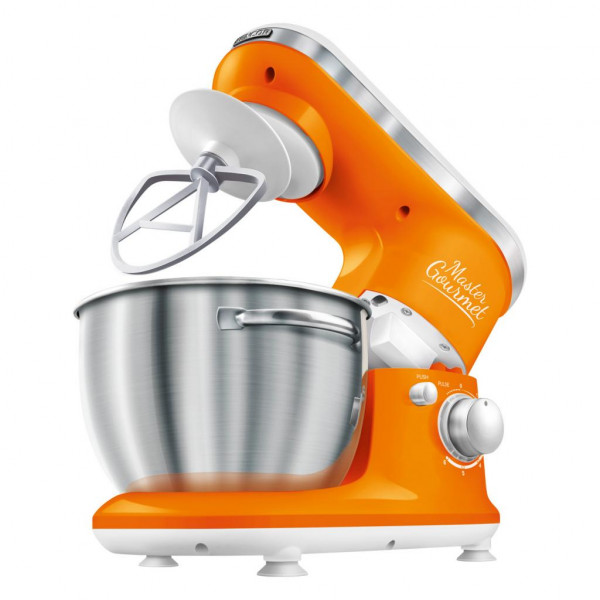 Ідеальний для приготування великих обсягів тіста, крему, збитих вершків, піни і т. Д. Чаша з нержавіючої сталі об'ємом 4 л. Місткість розрахована на приготування до 1,6 кг тіста. 4 знімні насадки: гак для замісу (для важкого, щільного тіста з дріжджами), віночок для перемішування в формі літери A (для кремів і легкого тесту без дріжджів), кулястий віночок для збивання (вершків, яєчних білків і ін.), кришка, яка захищає від розбризкування. Штикова система кріплення насадок дозволяє швидко надягати та змінювати їх. Планетарна система замісу, перемішування і збивання. насадки обертаються навколо своєї осі і одночасно навколо осі редуктора. Дозволяє переробляти 100% вмісту чаші.