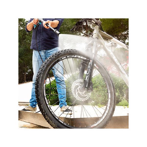 Інструмент оснащений розпилювальною насадкою, яка може регулювати тиск води на виході шляхом повороту наконечника. Вибирайте між струменями в концентрованому режимі для дуже стійких забруднень або в режимі розпилення для покриття великих поверхонь без ризику їх пошкодження, таких як певні ділянки автомобіля або велосипеда.