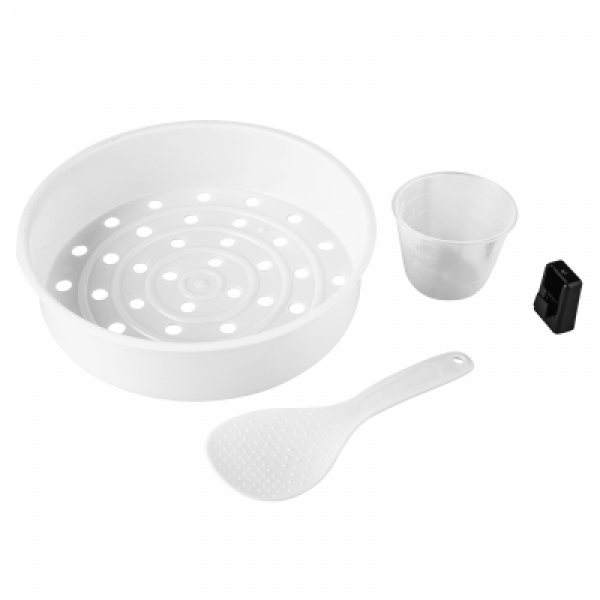 Ложка для перемішування, мірний стакан, ємність для приготування на пару і книга рецептів в комплекті.