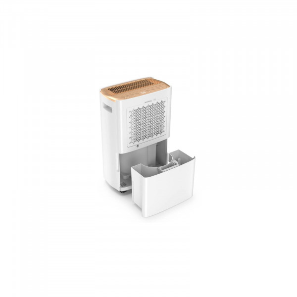 Споживана потужність пристрою становить 480 Вт, що робить його енергоефективним рішенням для побутового використання. Рівень шуму не перевищує 41 дБ, що гарантує тиху роботу навіть у нічний час. Осушувач працює в діапазоні температур від 5 °C до 38 °C, має стильний білий корпус із золотими елементами та габарити 380 x 229 x 595 мм.