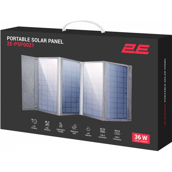 2E 2E-PSP0021 — це компактна та продуктивна портативна сонячна панель потужністю 36 Вт, призначена для заряджання смартфонів, планшетів, павербанків та інших гаджетів у будь-яких умовах. Вона стане надійним рішенням для тих, хто цінує автономність і потребує стабільного джерела живлення під час подорожей, кемпінгів або тривалого перебування поза мережею електропостачання.