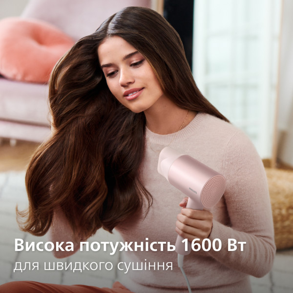 Фен Philips 3000 Series забезпечує ефективне сушіння завдяки високій потужності 1600 Вт, що дозволяє швидко створювати ідеальну укладку з оптимальною температурою повітря. Це дозволяє зекономити час та отримати відмінні результати.