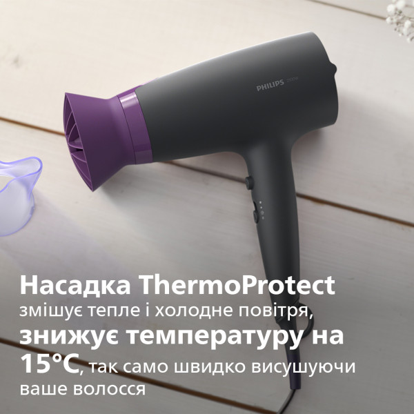 Насадка ThermoProtect з унікальною конструкцією змішує тепле та холодне повітря для дбайливого сушіння волосся.