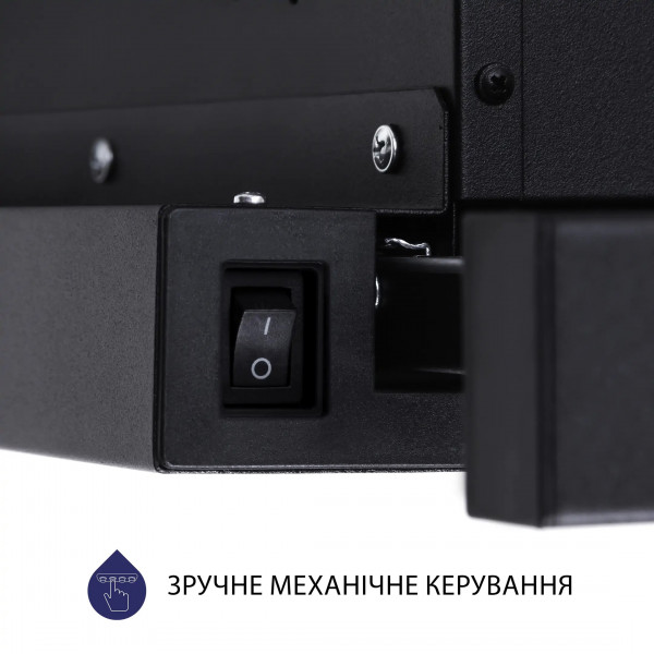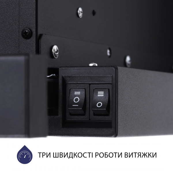 В основі витяжки мотор, який має досить високу потужність - 230 Вт. Такий робочий потенціал здатний забезпечити роботу на 2 швидкостях. При цьому максимальна продуктивність роботи дорівнює 1100 м3/год. З таким ресурсом можна обслужити кімнату великої площі, зробивши повітря чистим в одну мить. Механічні перемикачі Механічне управління пристроєм засноване на кнопкових перемикачах, які можна фіксувати в декількох положеннях. Розташовується така кнопка збоку. На ній є умовні позначення функціоналу, розібратися в яких зовсім нескладно.